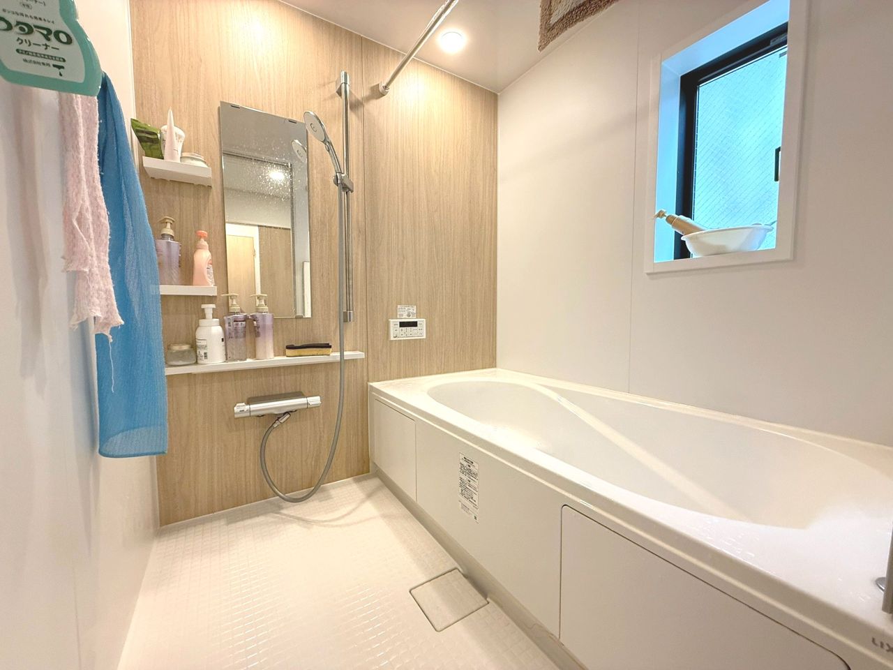 一日の疲れを癒す1坪タイプの浴室。足を伸ばしてゆったりと入れる浴槽。床、カウンター、排水溝などお掃除が大変な場所は、汚れがつきにくく、お手入れしやすい設計。