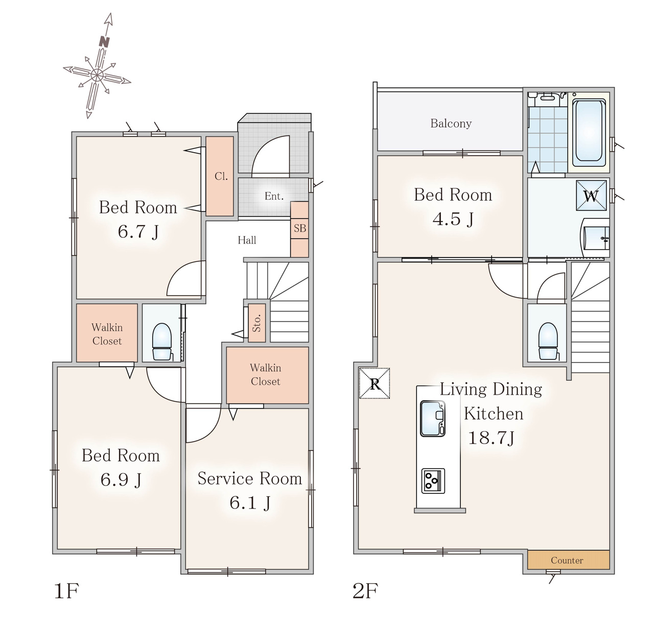 お洋服好きの方に喜ばれるウォークインクローゼットが2ヶ所付き。小物から大きなお荷物までしっかり収納することが出来ますね。随所に確保した収納がすっきりとした住空間を叶えてくれます。