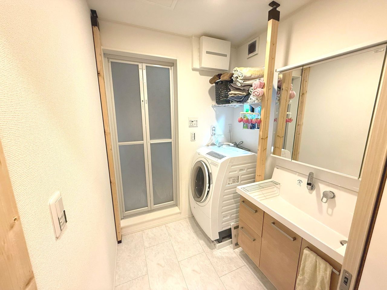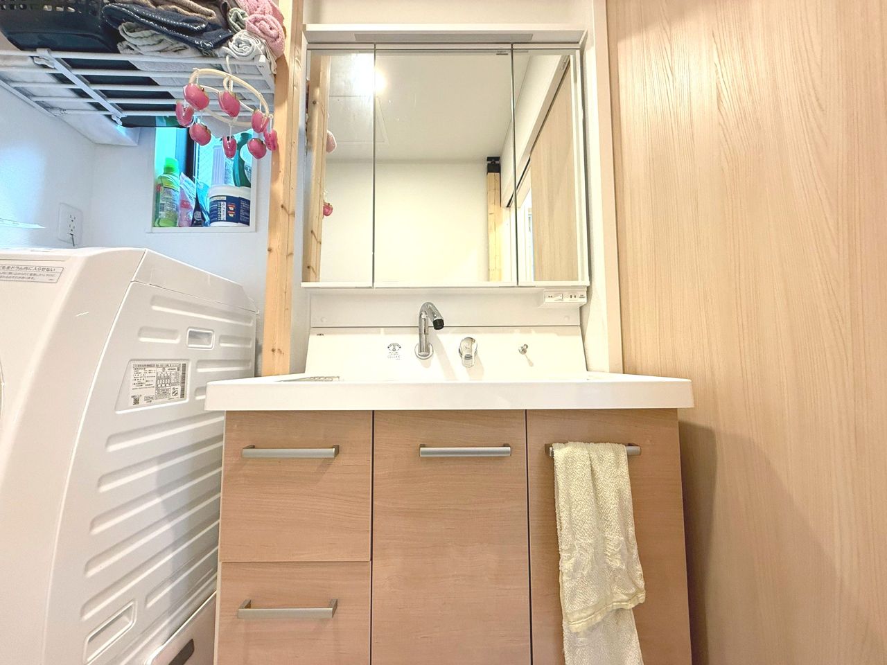 大きな三面鏡、実用性と機能美を兼ね備えた先進の洗面化粧台。ノズルが伸びお手入れもしやすくなっています。リネン類、ストック用品もしまえる豊富な収納量でスッキリ綺麗な空間を保っておけます。