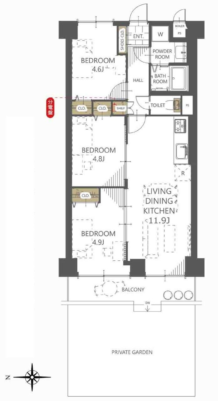 | 間取 | 3LDK (洋室4.9帖、洋室4.8帖、洋室4.6帖、LDK11.9帖) | ||