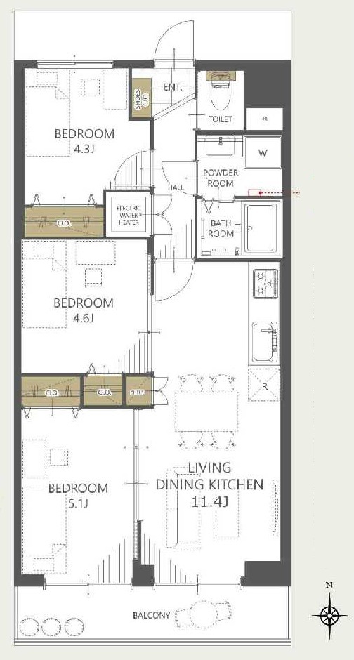 | 間取 | 3LDK (洋室5.1帖、洋室4.6帖、洋室4.3帖、LDK11.4帖) | ||