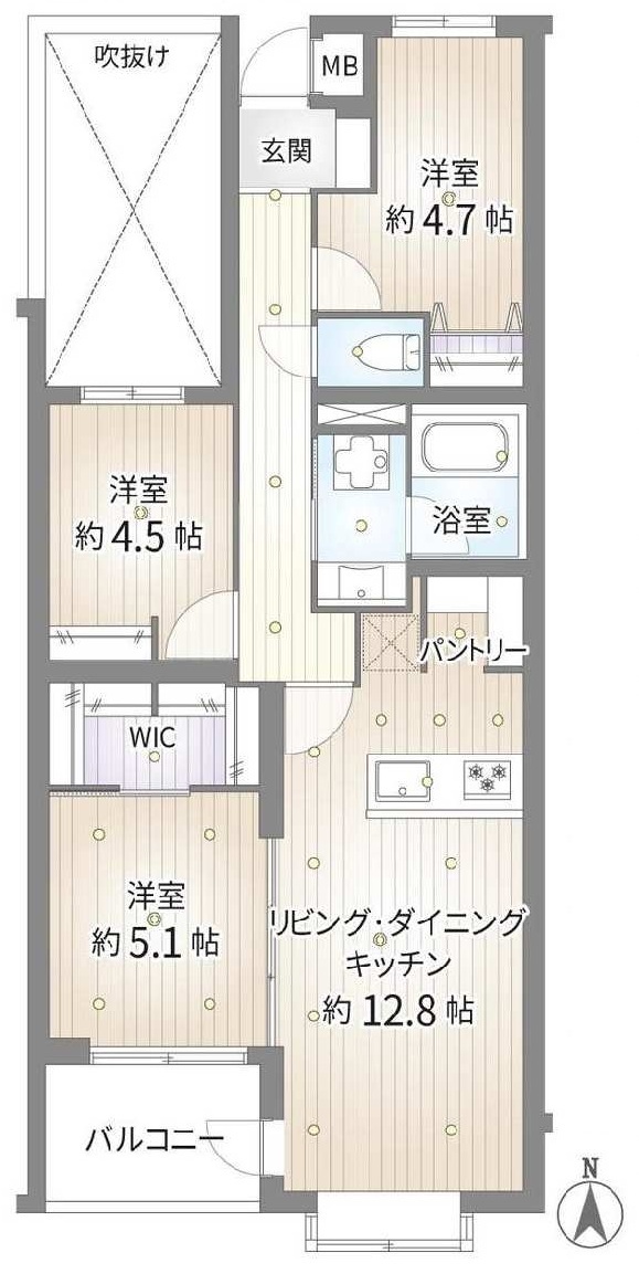 | 間取 | 3LDK + WIC/パントリー (LDK12.8帖、洋室4.7帖、洋室4.5帖、洋室5.1帖) | ||