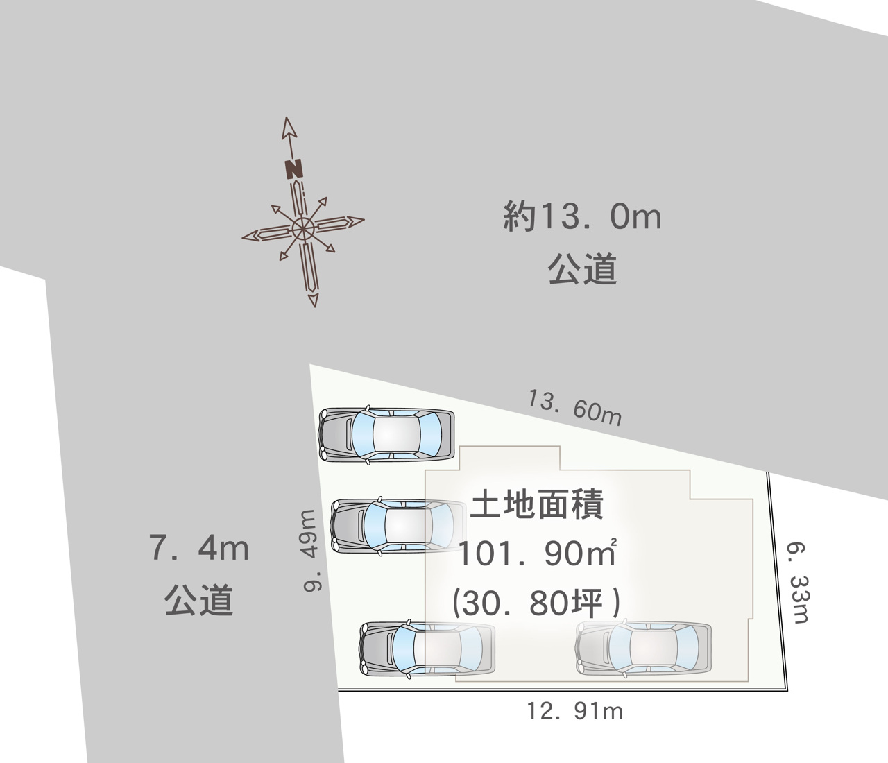 | 権利種類 | 所有権 | 接道 | 北東側13M道路に接道 西側7.4M道路に接道 |