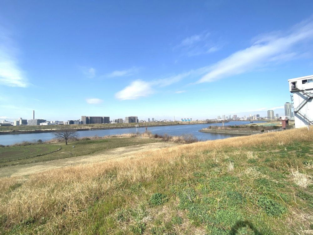 河川敷へ出ると荒川、新芝川が広々と広がっています。