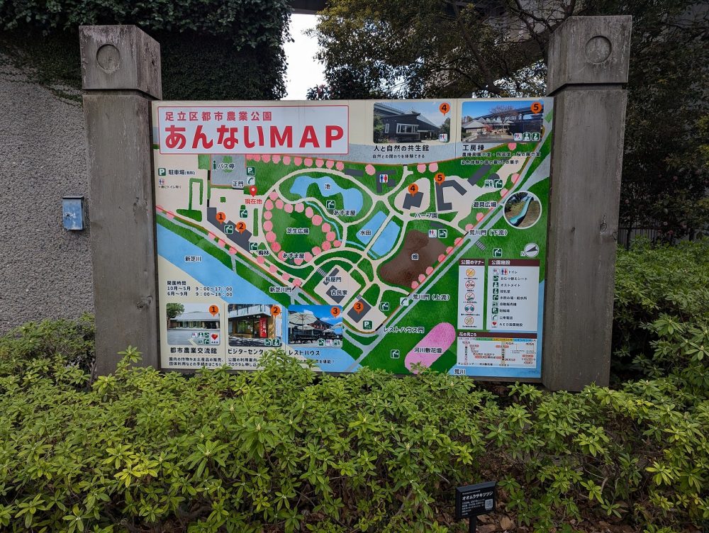 園内は荒川・新芝川に面した広々とした敷地に江戸時代後期の古民家や畑、田んぼなど日本の文化を楽しみながら体験できるつくりになっています。