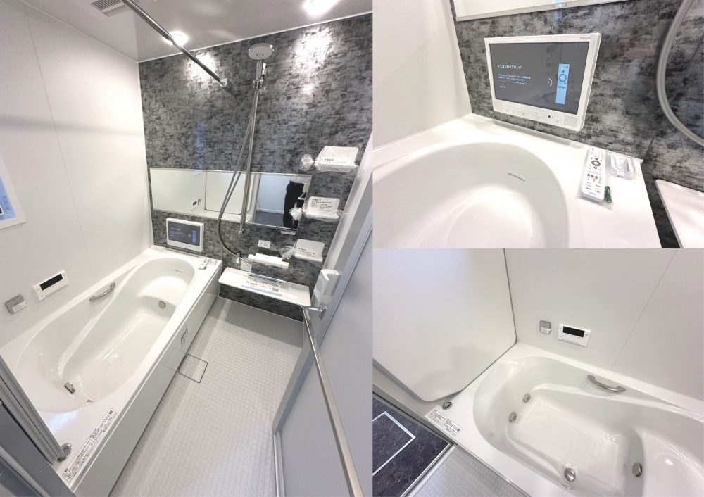 疲れた体を癒す上質な1坪タイプのバスルーム。浴室テレビ、ジェットバス付きで足を伸ばしてゆったりとくつろげます。他にも雨の日でもお洗濯物が乾かせる浴室換気乾燥暖房機も完備