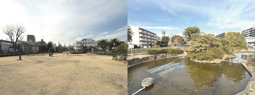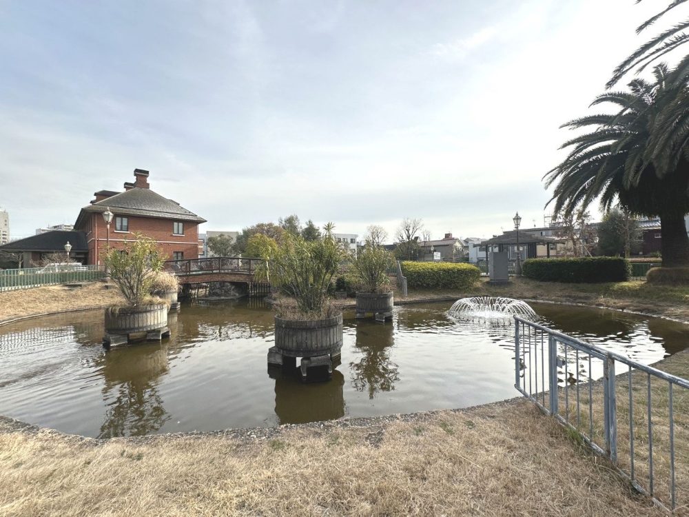 広々とした芝生広場は子供たちも安心して思いっきり走り回れます。噴水も備えた池、さすがに外来種は…という事で、ここは日本らしく鯉が泳いでおりました。