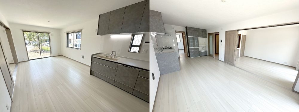 全室南向きの利点を活かし、より多くの光を採り込むように設計された室内。フローリングも明るい色を使用する事により室内を広く見せる事が可能です。