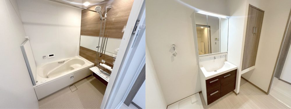 1坪タイプの浴室はバリアフリー対応の引き戸タイプ、また洗面化粧台の横に収納スペースを設けてリネン類やストック等がしまえます。