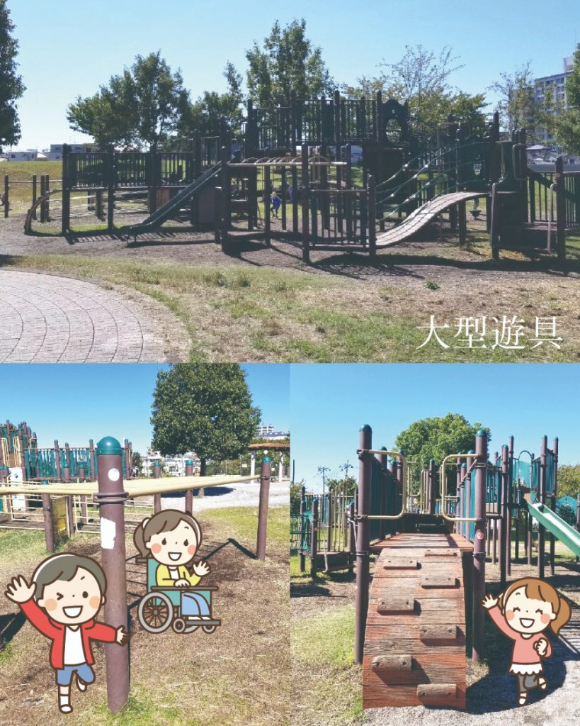 園内には、遊具の一部が段差のないスロープ状になっていて車いすでも遊べる大型の複合遊具があります。