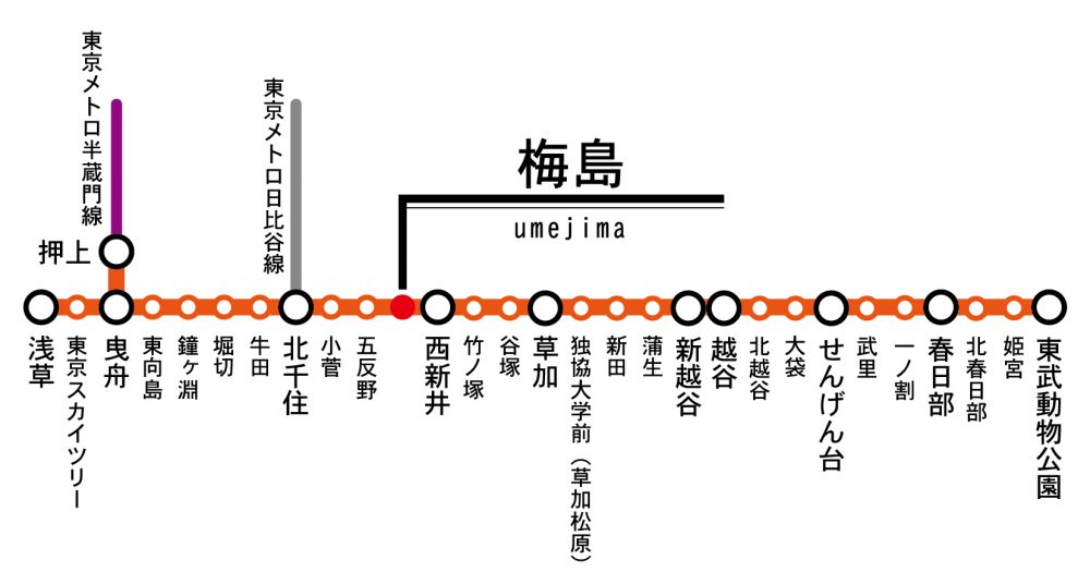 ターミナル駅「北千住」駅から草加方面に3駅目の「梅島(うめじま)駅」。