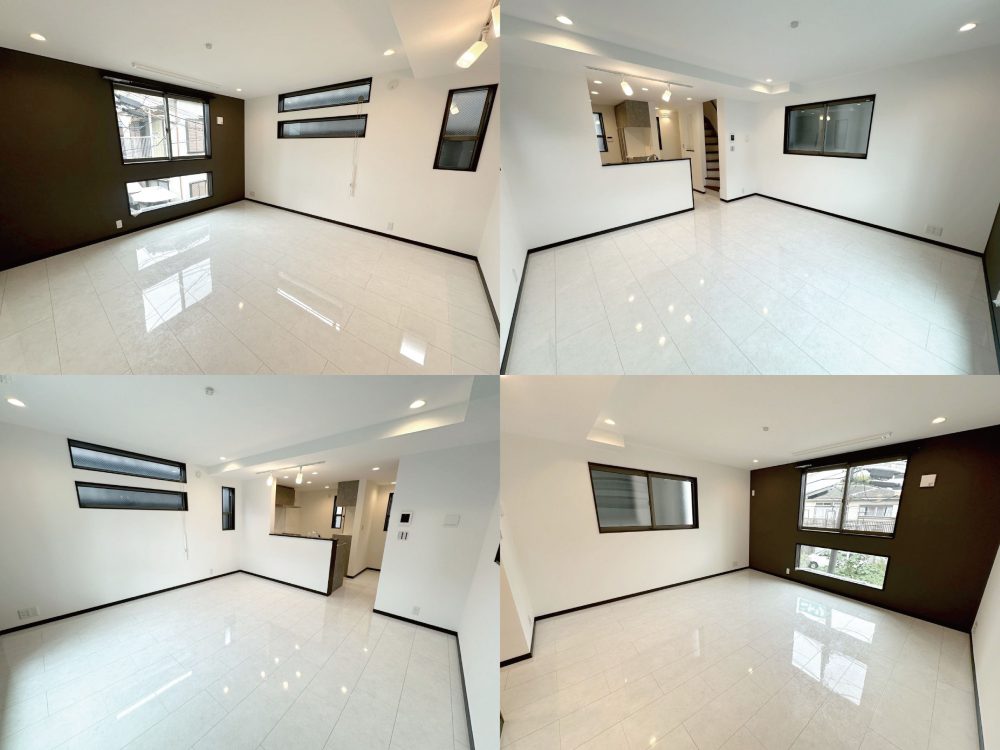LDK15.4帖の広さ、三面採光で採光もたっぷり。白を基調とした明るい空間です。