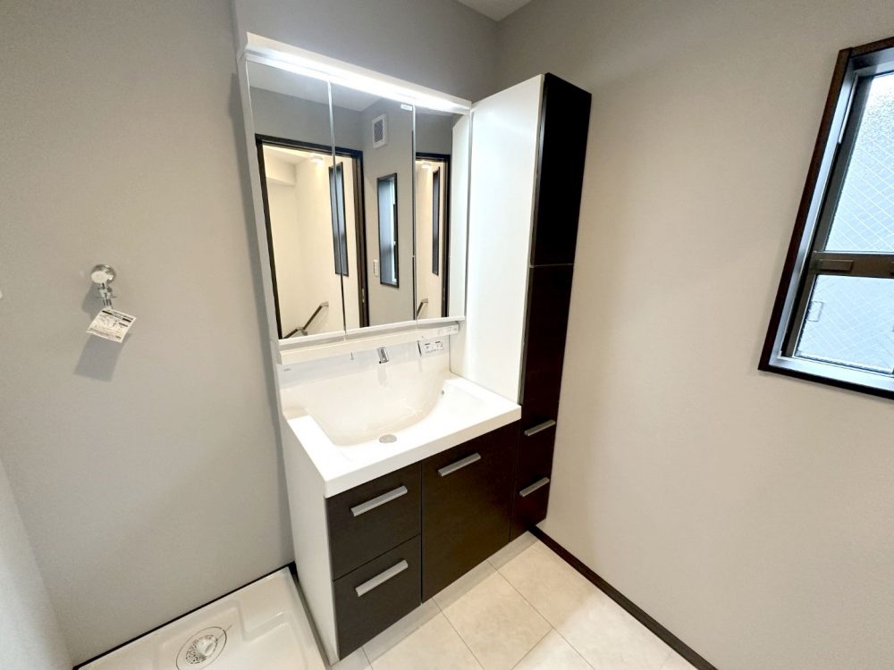 サイドにキャビネットがついた洗面化粧台を装備。かさばりがちなリネン類も家族の小物もすっきり収納できます。洗面所のアクセントクロスがシックな空間を演出!