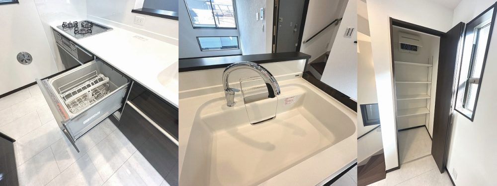 もちろん3口コンロや食洗機、浄水器なども標準装備。家事の時短をサポートする機能が満載です。