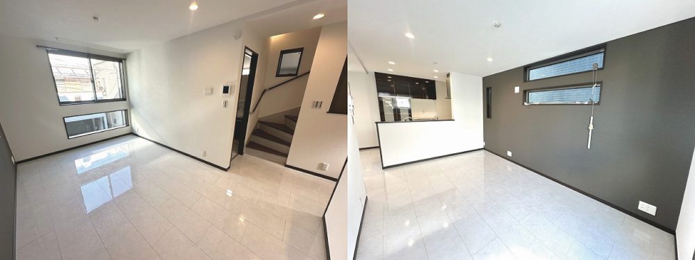 LDKは採光もしっかり。白を基調とし、スタイリッシュなアクセントクロスが空間を引き締めます。