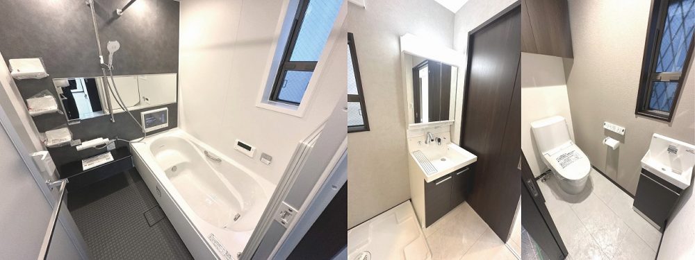 スタイリッシュなバスルームや手洗い付きのトイレなど