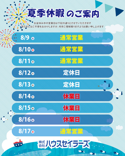 足立区の不動産ならハウスセイラーズ夏季休暇のお知らせ ニュース&トピックス 2025年8月7日 夏季休暇のお知らせ 誠に勝手ながら8月12月(火)~16日(土)まで夏季休暇に伴い休業とさせていただきます。 お客様にはご不便をお掛けいたしますが、何卒ご理解くださいますようお願い申し上げます。 なお、8月17日(日)より通常営業となります。 NEW